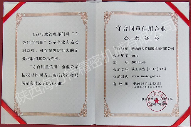 2015年6月18日陜西省工商行政管理局授予我公司——守合同重信用企業 證書