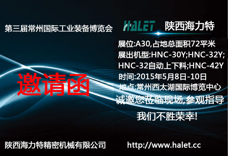 | 第三屆常州工業(yè)裝備博覽會(huì)將于2015年5月8日--10日在常州西太湖國(guó)際博覽中心盛大召開。屆時(shí)陜西海力特精密機(jī)械有限公司(展位號(hào):A30,占地總面積72平米)將攜HNC-30Y、HNC-32Y、HNC-32CB、HNC-42Y四款機(jī)床現(xiàn)場(chǎng)試加工。